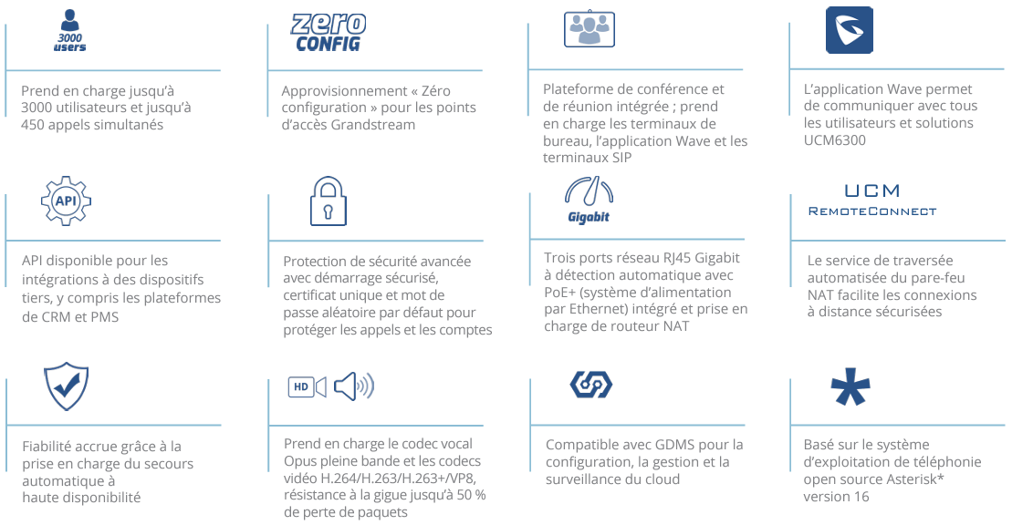 L’écosystème UCM6300 se compose de l’application Wave pour les ordinateurs de bureau, le web et les téléphones portables, qui fournit un concentrateur pour la collaboration à distance, et de UCM RemoteConnect, un service de traversée NAT dans le cloud pour assurer des connexions à distance sécurisées. La gamme UCM6300 offre également une configuration et une gestion du cloud par GDMS et une API pour l’intégration avec des plateformes tierces. En offrant une solution de communication et de collaboration unifiées haut de série, dotée d’une suite d’outils de mobilité, de sécurité, de réunion et de collaboration, la série UCM6300 propose une plateforme puissante pour toute organisation.